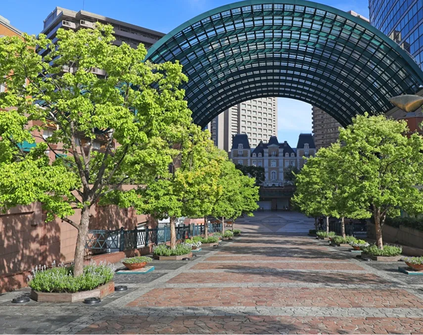 東口改札を右へに曲がり、動く歩道[スカイウォーク]を出て左へ、[くすの木通]を直進、交差点を渡って更に直進300m